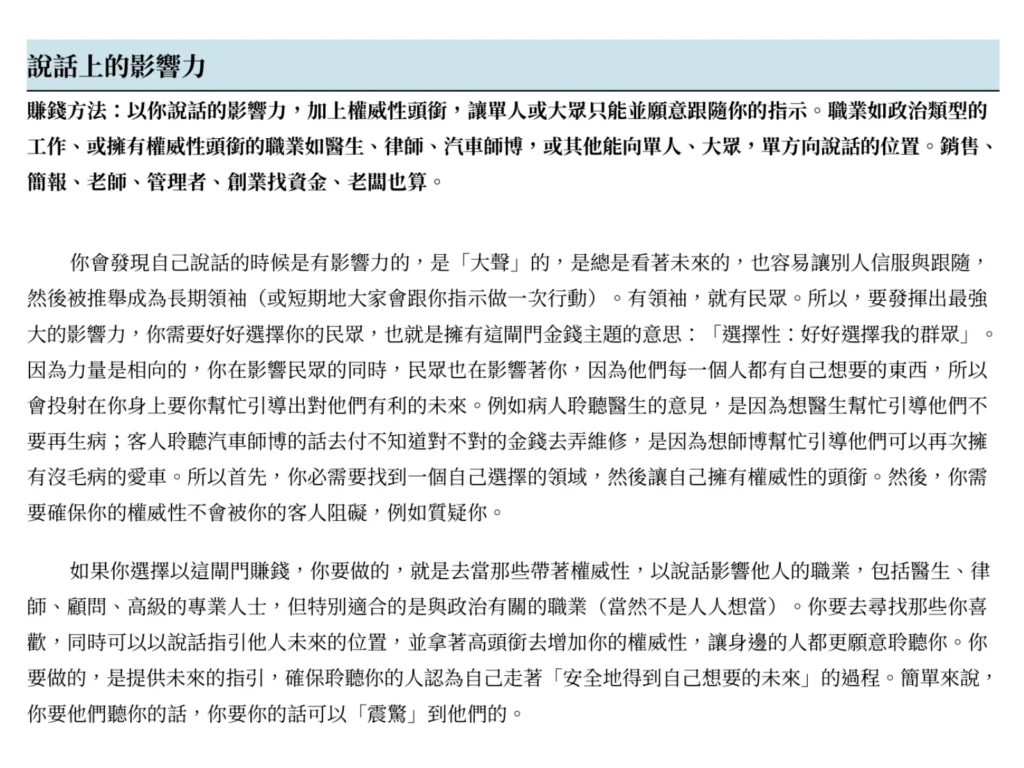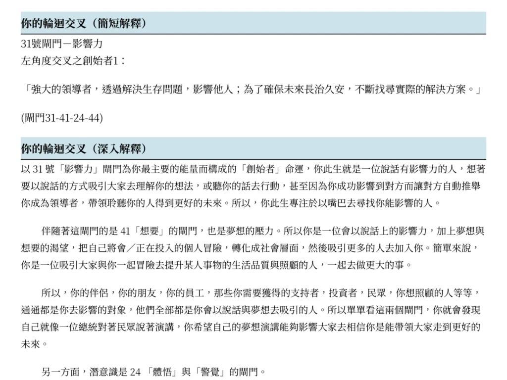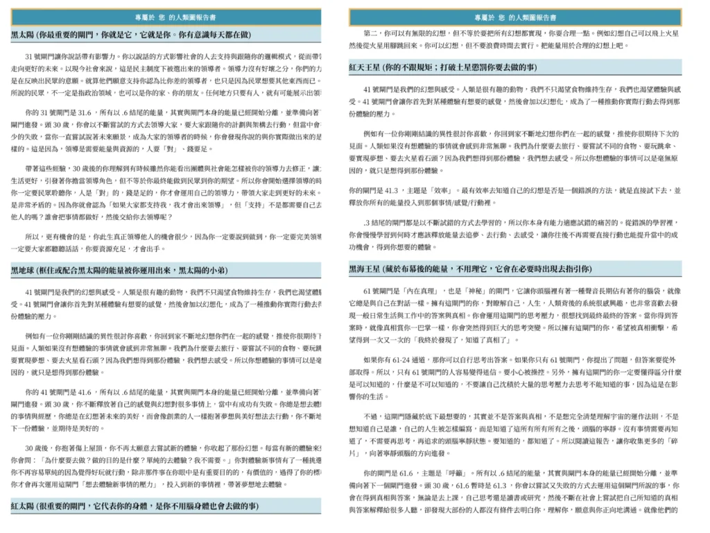 不只提供表面標籤,最核心的差異在於投入多年心力與分析數量之大所得出的整體經驗之談與洞見,以及「點數位置」等等的專業資訊,能精準捕捉你靈魂設計中的微小細節,也能讓你有一位「看過很多人」的老師在旁供你提問,這正是報告書服務的核心價值。