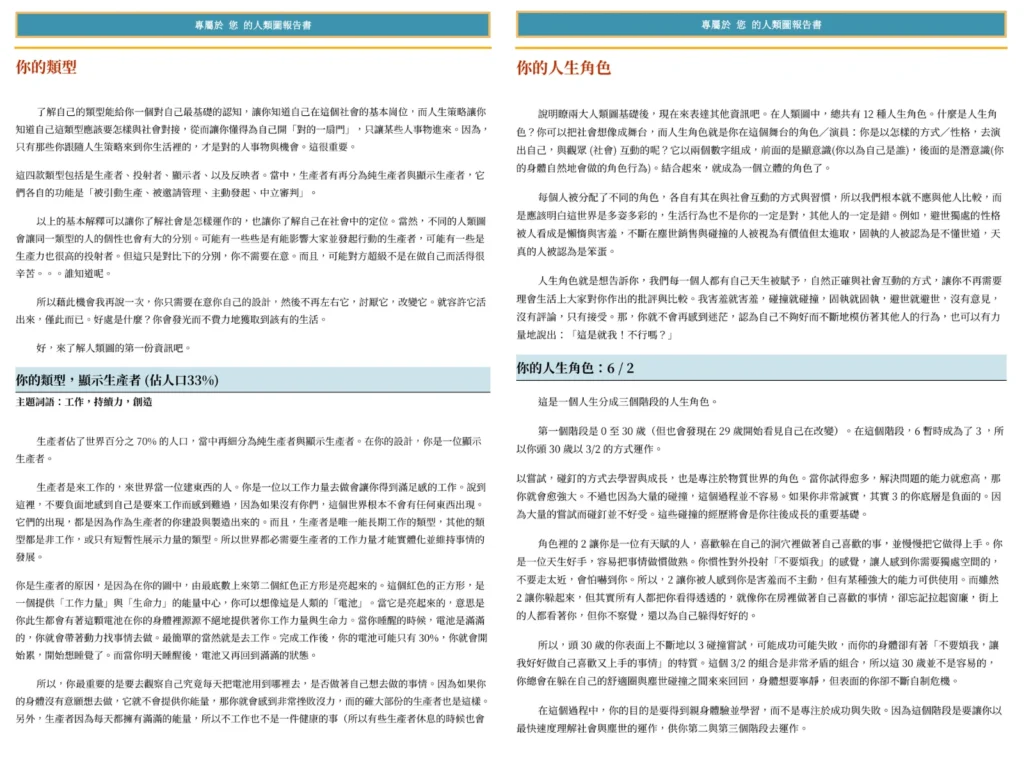 這份由美國官方認證人類圖分析師——陳濼文親自製作的專業人類圖分析報告,將是你遲到多年的「人生使用說明書」。